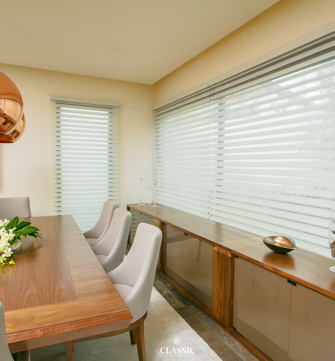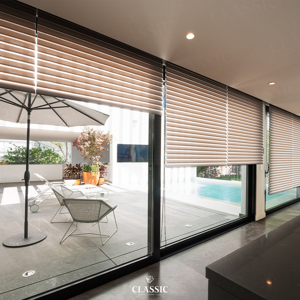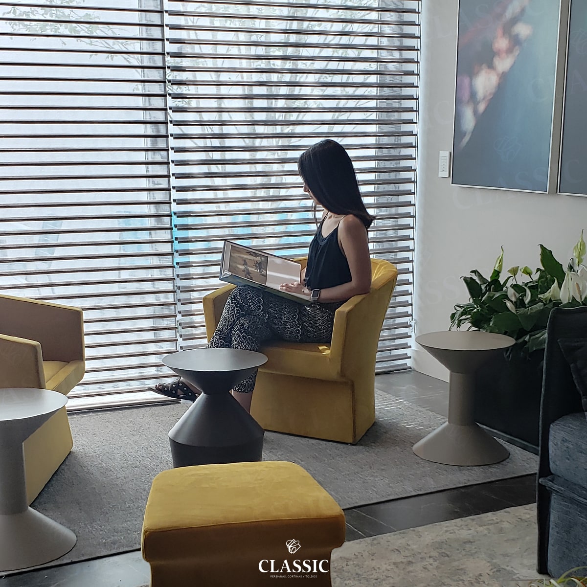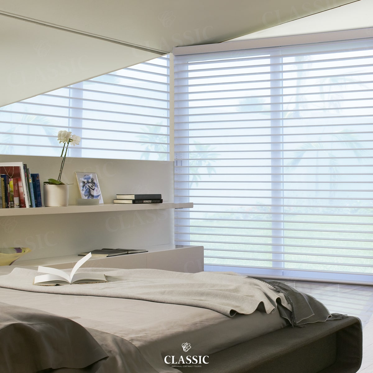 Persiana Shangri-la con el sistema tradicional de un lienzo, ideal para cubrir ventanas de hasta 2.95 mts de ancho*. Contamos con tejidos exclusivos para que selecciones el que más te adapte a tu decoración (*aplica para modelos seleccionados).