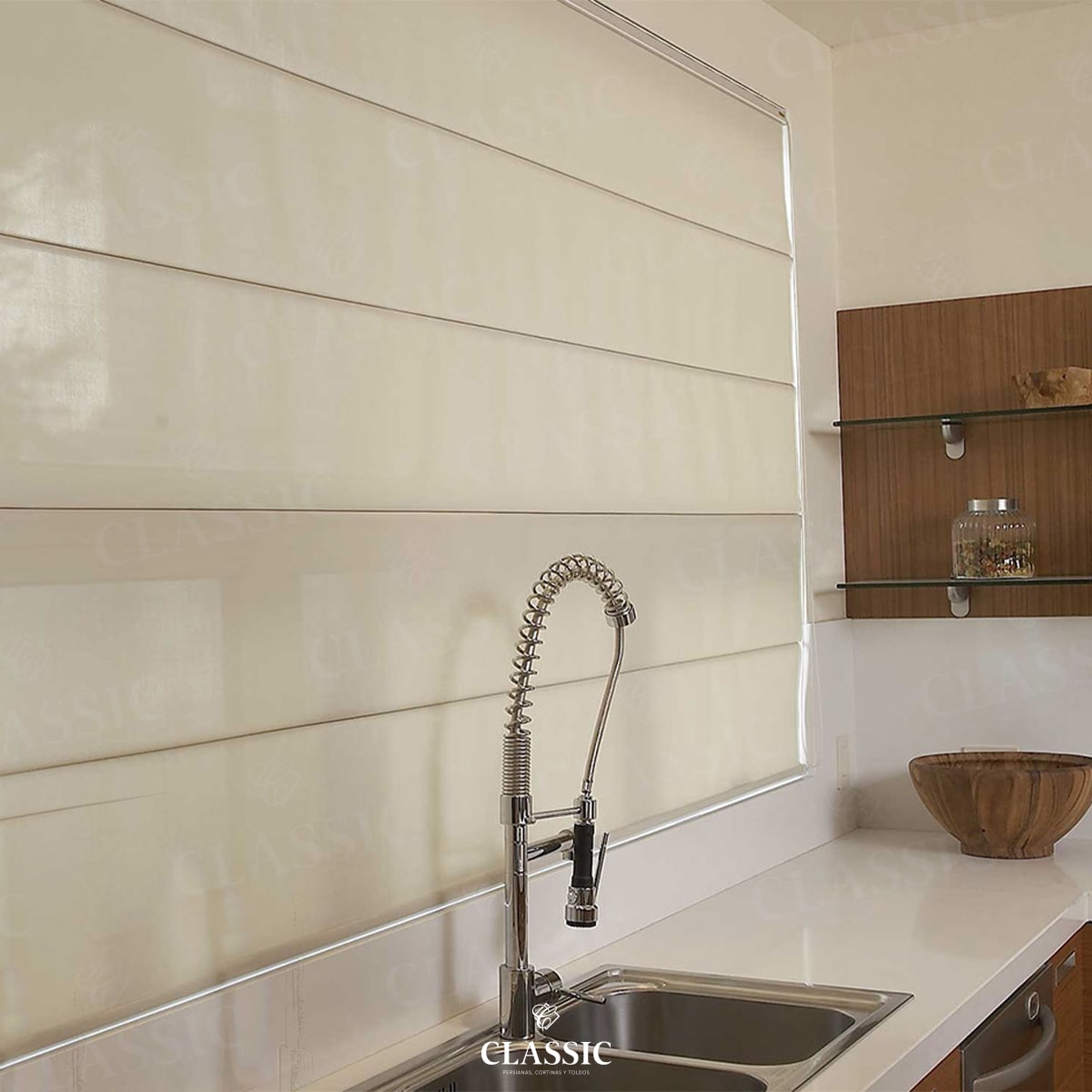 La funcionalidad de las persianas Roman Shades consiste en el manejo de módulos plegables que te permiten enrollar o desenrollar tu persiana gracias a unas varillas horizontales que se encuentran por dentro de la tela colocada en intervalos regulares.