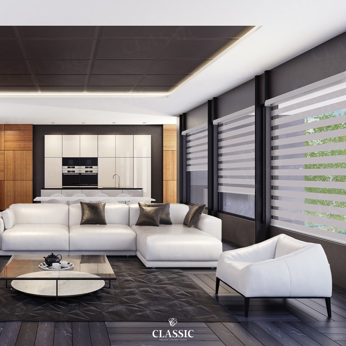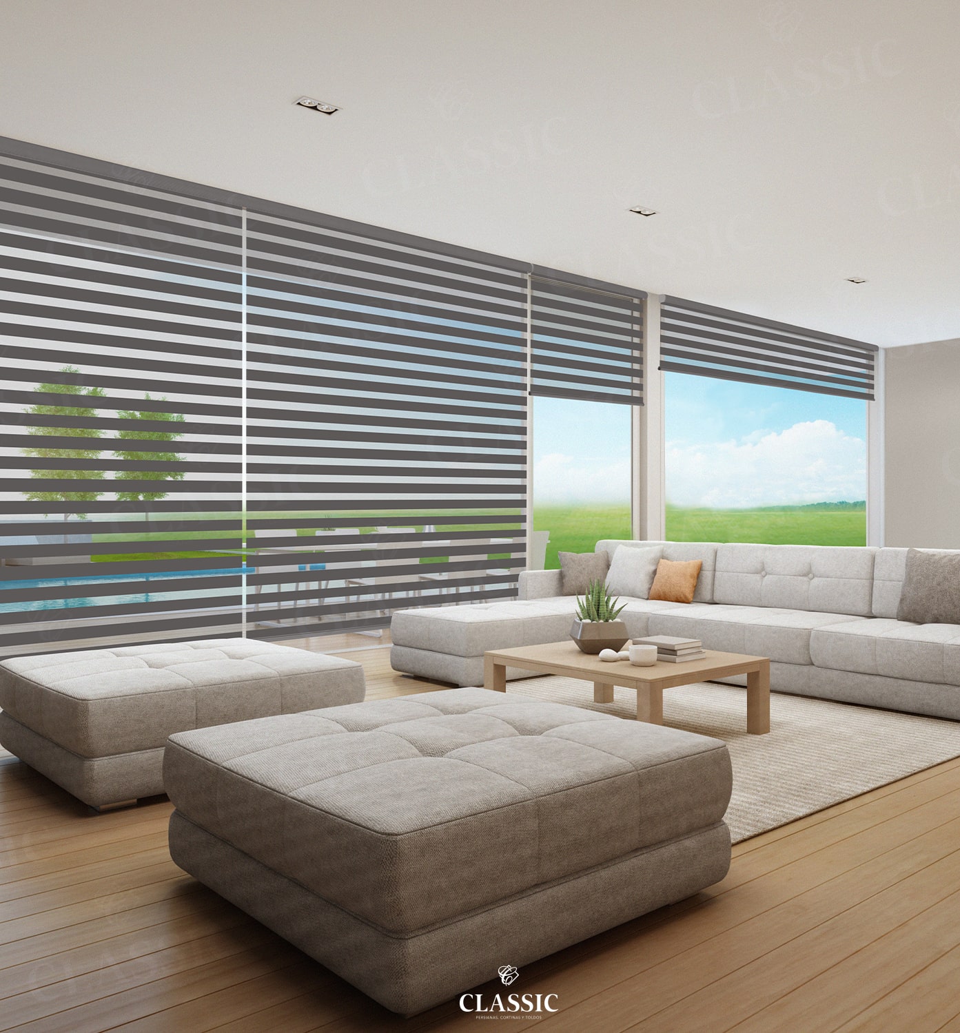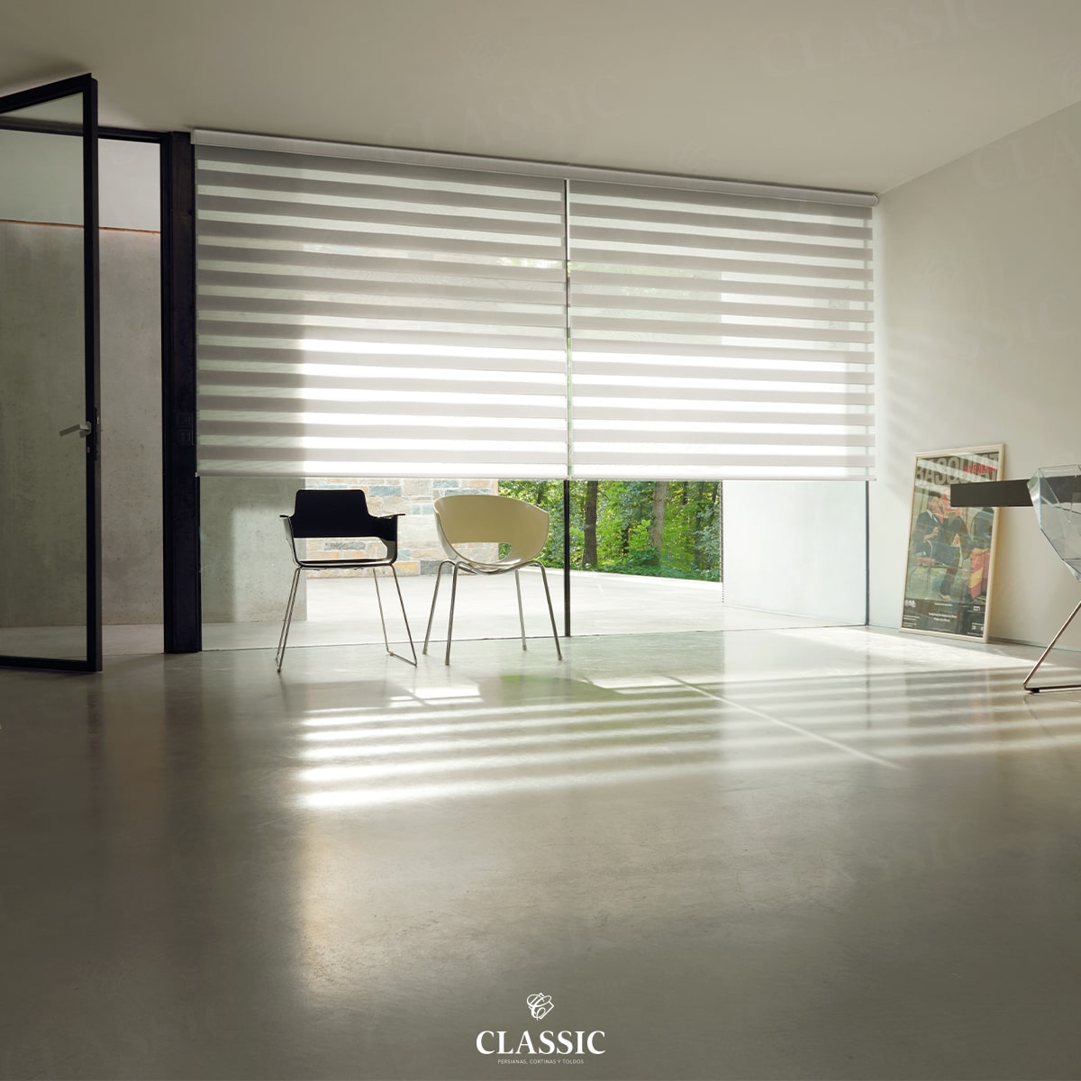 Óptima fusión entre la iluminación y la sombra, en donde se coordina perfectamente la visibilidad y la privacidad en una sola persiana. Además de eso, Wolett ó Sheer Elegance, te ofrece dos tipos de tela: Traslúcida y Room Darkening.