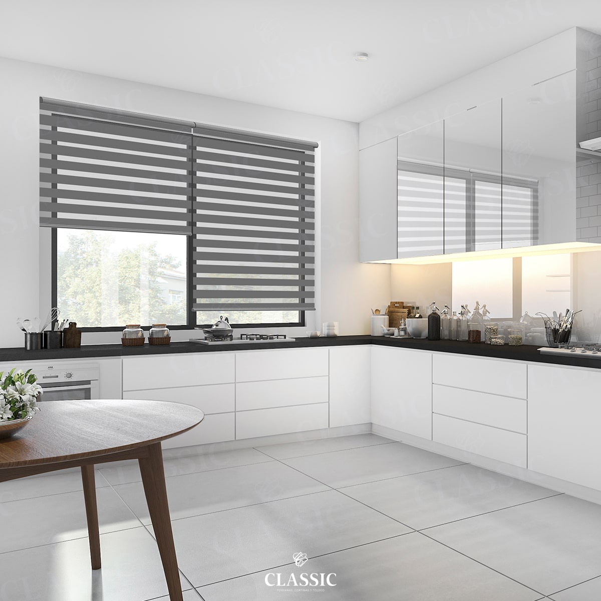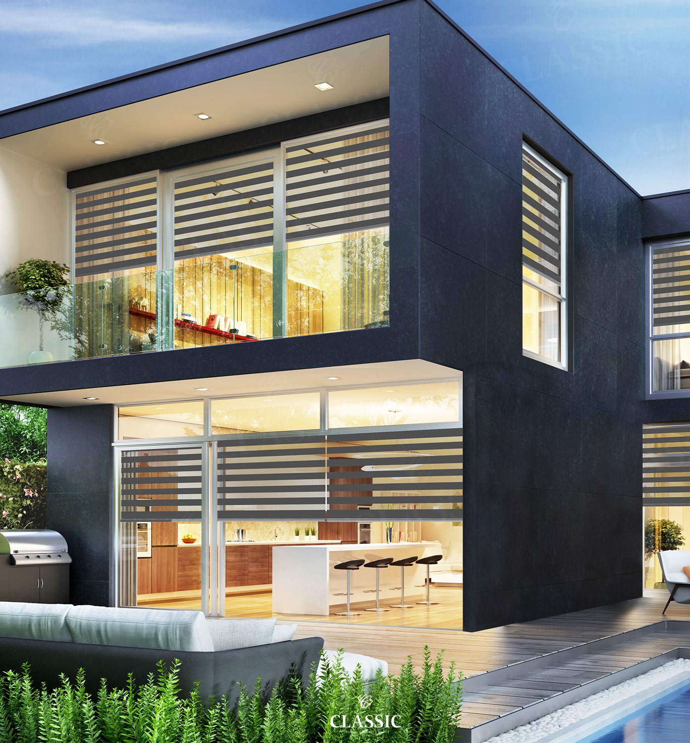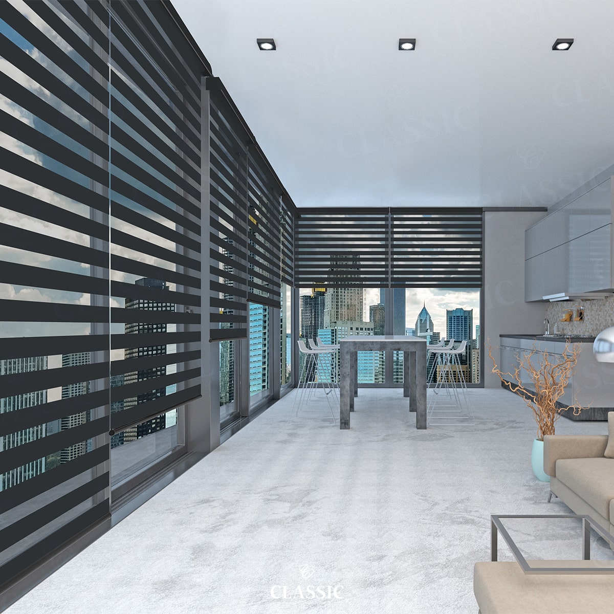 Óptima fusión entre la iluminación y la sombra, en donde se coordina perfectamente la visibilidad y la privacidad en una sola persiana. Además de eso, Wolett ó Sheer Elegance, te ofrece dos tipos de tela: Traslúcida y Room Darkening.